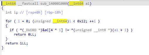 - 1이 반환되도록 하려면 *(unsigned __int8 *)(a1 + i)과 *(_DWORD *)&aC[4 * i]의 값이 동일해야함