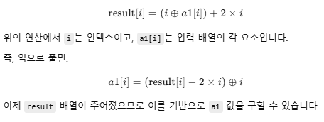 if 문이 성립하지 않기 위해서는 (i ^ *(unsigned __int8 *)(a1 + i)) + 2 * i)을 연산한 결과가 byte_140003000[i]의 값과 동일해야함