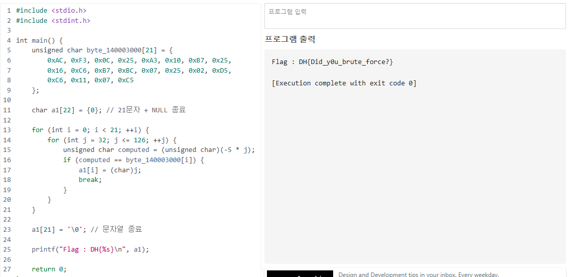 이 문제는 사용자에게 문자열 입력을 받아 정해진 방법으로 입력값을 검증하여 correct 또는 wrong을 출력하는 프로그램이 주어집니다. 해당 바이너리를 분석하여 correct를 출력하는 입력값을 찾으세요! 획득한 입력값은 DH{} 포맷에 넣어서 인증해주세요. 예시) 입력 값이 Apple_Banana일 경우 flag는 DH{Apple_Banana}