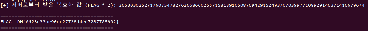 우리는 평문 상태의 결과를 받았으므로, 여기서 그냥 2로 나누기만 하면 원본 FLAG를 얻을 수 있다.