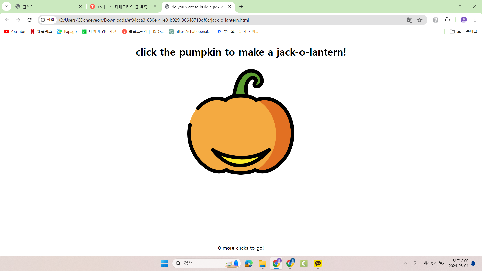 Description 할로윈 파티를 기념하기 위해 호박을 준비했습니다! 호박을 10000번 클릭하고 플래그를 획득하세요!