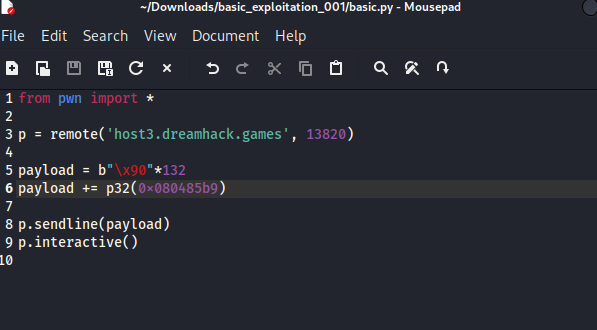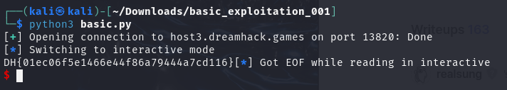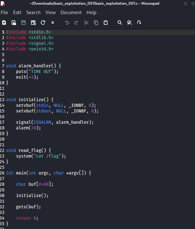 Description 이 문제는 서버에서 작동하고 있는 서비스(basic_exploitation_001)의 바이너리와 소스 코드가 주어집니다. 프로그램의 취약점을 찾고 익스플로잇해 "flag" 파일을 읽으세요. "flag" 파일의 내용