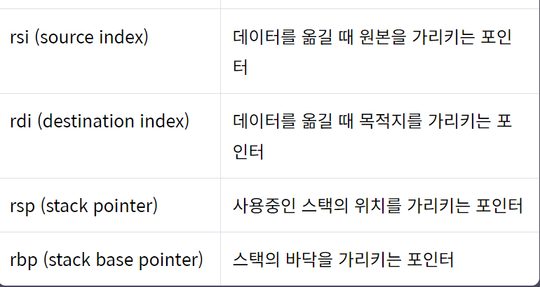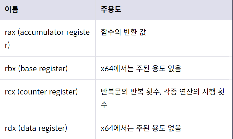 - x64 아키텍처에는 범용 레지스터(General Register), 세그먼트 레지스터(Segment Register), 명령어 포인터 레지스터(Instruction Pointer Register, IP), 플래그 레지스터(Flag Register)가 존재
